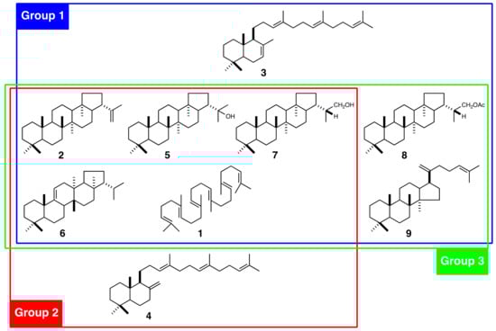 Triterpenoids isolated from Polystichum ferns and chemotaxonomic classification based on the triterpenoid profile. Group 1 includes P. polyblepharum, P. fibrilloso-paleaceum, and P. pseudo-makinoi; Group 2 includes P. rigens; and Group 3 includes P. longifrons, P. makinoi, and P. lepidocaulon. 1, squalene; 2, hop-22(29)-ene; 3, γ-polypodatetraene; 4, α-polypodatetraene; 5, 22-hydroxyhopane; 6, fern-9(11)-ene; 7, dryocrassol; 8, dryocrassyl acetate; and 9, dammara-18(28),21-diene.