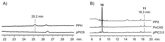 The ORF of PPX was subcloned into the expression vector pPIC3.5. The construct was transformed into P. pastoris strain GS115. A cell-free extract prepared from the induced transformant culture was used to test the in vitro reaction. The recombinant PPX cyclized racemic 2,3-oxidosqualene (10) to a product not detected in the negative control yeast cell homogenate carrying the empty vector pPIC3.5. Gas chromatography (GC) analysis showed that the hexane extract of the in vitro reaction of PPX was superimposed onto that of PnCAS (Figure 2B) [13]. Therefore, the cDNA sequence of PPX encodes P. polyblepharum CAS.