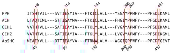 Partial amino acid sequence alignment of hydroxyhopane/hopene synthases. Numbers above the sequence show positions in PPH, and numbers below the sequence show those in AaSHC. Red boxes indicate active site residues, which might influence the final cation elimination reaction.