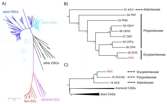 A phylogenetic tree was constructed based on the neighbor-joining method (Figure 4) to elucidate the phylogenetic relationships of the deduced amino acid sequences of PPH and PPX with other known SC and OSC members. The sequences were separated into three divergent clades (such as SC and OSC). In the SC clade, the fern SCs were clearly divided into those for bacteria. The PPH of a hydroxyhopane synthase clustered with DCD (a dammaradiene synthase from Dryopteris crassirhizoma), but not with ACH; Figure 4B). The OSC clade consisted of a plant and the remaining eukaryotic OSC subclades. The plant OSC subclade was resolved as a monophyletic family separating into CAS and the other OSC clusters. The fern CASs, including PPX, were grouped together and clearly separated from those of higher plant origin. PPX was found to be closely related to PNX (Polypodiodes niponica), but not to ACX (A. capillus-veneris).