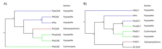 To test the hypothesis, we isolated cDNAs encoding SC and CAS from six Polystichum ferns. Since SC and CAS synthesize triterpenes, a phylogenetic tree reconstituted from these sequences could reflect the triterpene profile-based chemotaxonomic relationship. Therefore, the six chosen Polystichum plants had different triterpene profiles and were classified into three different groups (Figure 1). The phylogenetic analysis showed that Polystichum CASs were entirely separate from the other fern CASs (ACH and PnCAS). The phylogenetic tree topology of this subclade reflected chemotaxonomic classifications except for PleCAS (Figure 5A). A recent classification performed by Zhang and Barrington [27] arranged Polystichum into two subgenera whose identities were verified by molecular phylogenetic analysis with multiple plastid loci [28]. Of the seven species surveyed in the present study, P. lepidocaulon (PleCAS) belongs to the subgenus Haplopolystichum, whereas the others belong to the subgenus Polystichum. The relationship between PleCAS and the other six CASs implies that these two subgenera are distantly related. This finding might also be consistent with those reported for certain phylogenetic studies based on plastid markers. The clade consisting of the subgenus Polystichum appears to represent the chemotaxonomic relationship alone, rather than the previous classification supported by morphological features and conventional molecular data (plastid loci). Five of the six species belong to the Hypopeltis section, whereas P. rigens is a member of the Xiphopolystichum section. The fact that these two sections are grouped together suggests that the phylogenetic tree based on CASs and SCs might resolve relationships other than those revealed by plastid marker-based analyses.