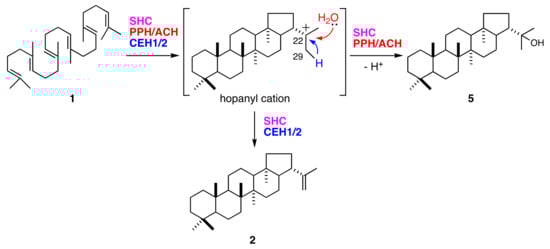 Synthesis of 22-hydroxyhopane (5) consists of squalene (1) activation by cationic attack, followed by a cascade of cation-olefin cyclizations and quenching of the pentacyclic carbocation by the addition of water. The hop-22(29)-ene (2) reaction pathway is mostly shared by that of (5). They diverge at the final step in which their hopanyl cation quenching modes differ (Figure 6). Deprotonation of C29 from hopanyl cation produces (2). Bacterial hopene synthases (squalene-hopene cyclases; SHCs) also produce (2) and (5) [24,25]. The (2):(5) ratio is 84:16 for Alicyclobacillus acidocaldarius SHC [26]. In contrast, all fern hydroxyhopane- and hopene-synthases, including PPH, are monofunctional enzymes [11,14]. These findings suggest that fern hydroxyhopane- and hopene-synthases have more finely tuned catalytic capabilities than bacterial ones, with respect to the final cation elimination step.