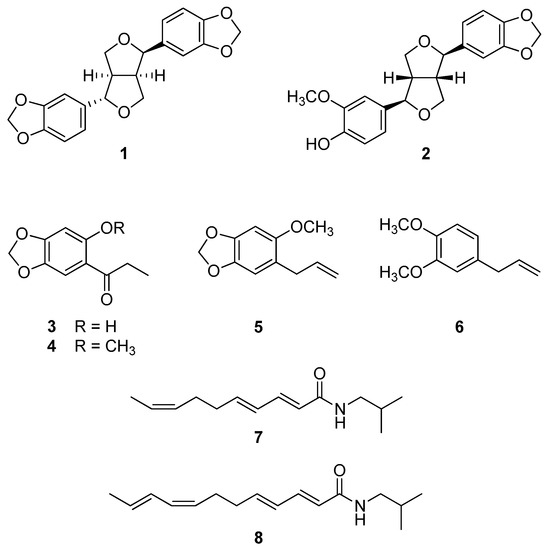 Two tetrahydrofurofurano lignans (1 and 2), four phenylpropanoids (3–6), and two alkamides (7 and 8) were isolated from the active EtOAc-soluble fraction of the roots of A. sieboldii. The chemical structures of the isolates were identified to be (−)-asarinin (1) [19], (−)-pluviatilol (2) [20], kakuol (3) [21], methylkakuol (4) [21], asaricin (5) [22], methyleugenol (6) [23], (2E,4E,8Z)-N-isobutyldeca-2,4,8-trienamide (7) [23], and (2E,4E,8Z,10E/Z)-N-isobutyldodeca-2,4,8,10-tetraenamide (8) [24], by analysis of spectroscopic data (1H-NMR, 13C-NMR, 2D-NMR, and MS) measurements, and by a comparison of their data with published values (Figure 1).