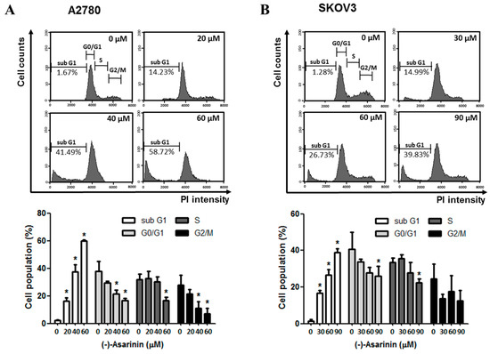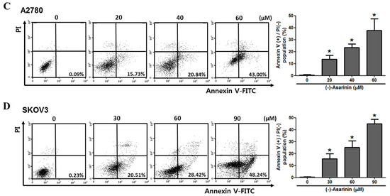 We found that (−)-asarinin (1) increased the fractionation of the nuclei accumulated at Sub G1 in A2780 and SKOV3 cells, but it failed to induce cell cycle arrest, which is one mechanism of growth inhibition (Figure 2A,B). Therefore, we further explored the molecular mechanism of the cytotoxic activity of (−)-asarinin (1) in human ovarian cancer cells. Dysfunction of apoptosis signaling pathways is associated with cancer development [32]. Therefore, compounds that promote apoptosis in cancer cells are considered as good candidates for anti-cancer chemotherapeutics. To examine whether (−)-asarinin (1)-induced cell death is mediated by the induction of apoptosis, two ovarian cancer cells A2780 and SKOV3 cells were treated with (−)-asarinin (1) and subsequently co-stained with PI and Annexin V-FITC. Treatment with (−)-asarinin (1) increased the percentage of Annexin V-FITC positive/PI negative cells by up to 43% in A2780 cells and 48% in SKOV3 cells (Figure 2C,D). These results suggest that the (−)-asarinin (1)-induced cell death is associated with the induction of apoptosis in human ovarian cancer cells.