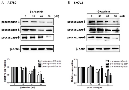The effect of (−)-asarinin (1) on caspase activation in human ovarian cancer cells. A2780 (A) and SKOV3 (B) cells were treated with the indicated concentration of (−)-asarinin (1) for 48 h. Procaspase-3, -8, and -9 levels were determined by Western blot assay. β-Actin was used as an internal control. A representative protein immunoblot of three independent experiments is shown. Data are presented as the means ± SD of three independent experiments. Statistical significance was determined by one-way ANOVA. * p < 0.05 as compared with the untreated group.