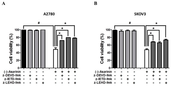The effect of caspase inhibitors on (−)-asarinin (1)-induced cell death in human ovarian cancer cells. A2780 (A) and SKOV3 (B) cells were pretreated with caspase-3 inhibitor z-DEVD-fmk (50 μM), caspase-8 inhibitor z-IETD-fmk (50 μM), and caspase-9 inhibitor z-LEHD-fmk (50 μM) for 30 min, and then treated with the indicated concentration (A2780; 40 μM and SKOV3; 60 μM) of (−)-asarinin (1) for 48 h. A MTT (3-(4,5-dimethylthiazol-2-yl)-2,5-diphenyl-tetrazolium bromide) assay was performed to determine the cell viability after (−)-asarinin (1) treatment. Statistical significance was determined by Student’s t-test. # p < 0.05 as compared with the untreated group and * p < 0.05 as compared with the (−)-asarinin (1) only-treated group.