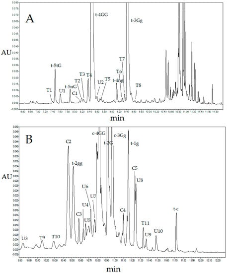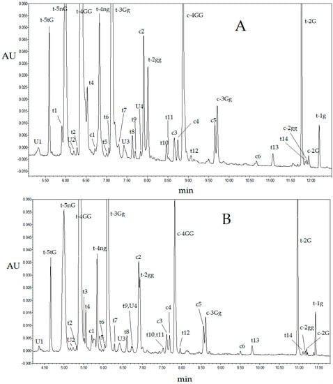 Ultra high-performance liquid-chromatography-diode-array (UHPLC-DAD) chromatograms detected at 440 nm of a saffron extract obtained with the column Kinetex C18 at (A) tg = 10 min, T = 25 °C and (B) φ = 0.60 mL/min and tg = 10 min, T = 25 °C and φ = 1.00 mL/min. Peak assignments are reported in Table 1.