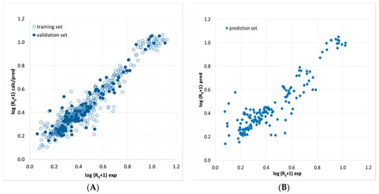 Agreement between (A) experimental (exp) resolutions and (B) calculated or predicted (calc/pred) responses of the ANN-based model. Rij, resolution of peak pairs.