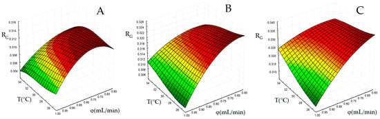 Plots of response surface for global resolution (RG) as a function of column temperature (T) and eluent flow rate (φ), the eluent gradient duration (tg) kept fixed at 8 (A), 10 (B) or 12 min (C).