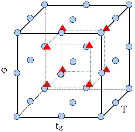 In this work, we evaluated the combined effect of the eluent flow rate (φ), the column temperature (T) and the duration of the first linear step of the eluent gradient profile (tg) on the chromatogram resolution. A full-factorial three-level DOE [35] was used to identify suitable combinations of the above three factors. Table 4 displays the three levels, lower, medium and higher (−1, 0 and 1, respectively), for each factor. Eight additional experiments were performed in the central points of the eight cubic subspaces of the experimental domain and were used for external validation. Figure 5 graphically displays the points of the full-factorial DOE and the external data points.