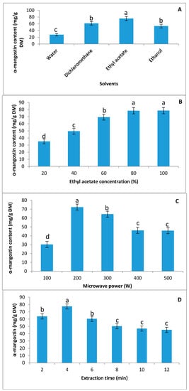 The effect of various solvents, the concentration of solvent, and microwave power on α-mangostin content in the extraction process. (A) Effect of various solvents on the extraction yield of α-mangostin; (B) effect of ethyl acetate concentration on the extraction yield of α-mangostin; (C) effect of microwave power on the extraction yield of α-mangostin; (D) effect of various extraction times on the extraction yield of α-mangostin. Different superscript lower-case letters (a,b,c,d) indicate significant differences at p < 0.05 (Duncan’s test).
