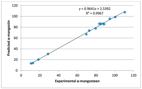An RSM approach was employed to determine the effects of extraction conditions, including time (min; X1), microwave power (W; X2), and ethyl acetate concentration (v/v %; X3), on the extraction of bioactive compounds from mangosteen pericarp cultivated in Malaysia. The α-mangostin concentration of the extracts is reported in Table 1. The highest concentration of α-mangostin (116.8 mg/g DM) was observed at an extraction time of 3 min, a microwave power of 150 W, and 70% ethyl acetate. The experimental data were fitted to a second-order polynomial model. Table 2 illustrates the regression coefficients of the model, which were considered significant (p < 0.05). In fact, the statistical analysis showed that microwave power and ethyl acetate concentration had a significant effect on the α-mangostin concentration. No significant effect of extraction time was observed for α-mangostin content in the extract. In addition, the results showed that the microwave power of extraction and ethyl acetate concentration resulted in a positive quadratic effect on the response. It is clear that there was a significant interaction between the microwave power and the ethyl acetate concentration parameters on the α-mangostin concentration. Table 2 summarizes the validity of the model that was examined using lack-of-fit testing. An ANOVA for the lack-of-fit test for the α-mangostin response was not significant, confirming that the model adequately described the experimental data. In addition, a satisfactory determination coefficient (R2) of 0.983 was obtained for α-mangostin, which represented an excellent correlation between the independent factors and the response. A higher R2 value indicates a better fit of the experimental model to the real data. Alternatively, a lower the value of R2 signifies a lower correlation; however, this can elucidate the behavior of independent variables. As shown in Table 1, the experimental value of the α-mangostin content was close to the predicted value, and there was no significant difference between the predicted and experimental values. An analysis of the regression (Figure 2) also showed that the predicted value of α-mangostin was correlated linearly and significantly with the experimental value (R2 = 0.9967).