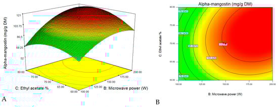 The response surface plots for the effects of microwave power (W) and ethyl acetate concentration (%) on the α-mangostin content of G. mangostana. (A) Three-dimensional (3D) view; (B) flat view.