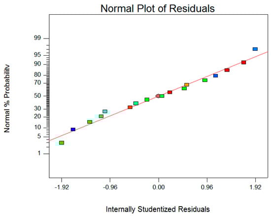 After validating the model, three-dimensional response surfaces (Figure 3) were plotted, and a normal plot of residuals (Figure 4) was generated for the α-mangostin concentration against the two significant combined factors, including microwave power and ethanol concentration, while the third factor was set to be constant at a level (−1) corresponding to 40 min. As clearly shown from Figure 3, the α-mangostin concentration increased with increasing microwave power for the extraction and decreasing ethanol concentration. The corresponding area (red color) is extremely large, and it represents a value that can be close to 100% when the extraction time was set at 40 min. Ethyl acetate is soluble in water, and it is a sufficiently polar solvent to be heated using microwave energy. The polarity of the solvent is very important during microwave-assisted extraction procedures. Therefore, the mixture of water with alcohol makes it a moderately polar solvent to ensure the maximum extraction of secondary metabolites [33]. Furthermore, there is a general “like dissolves like” principle that explains that different solvents only extract phytochemicals/secondary metabolites that share a similar polarity. Polar solvents possess the ability to absorb more microwave energy because of their high dielectric constant [33,34]. Even the completely dried plant cells contain traces of moisture that are targeted by microwave energy. In the microwave extraction method, water molecules present within the plant texture quickly absorb microwave energy, causing a significantly higher temperature inside cells [35]. With increasing internal temperature, cell disruption is facilitated by internal superheating that further induces the desorption of phenolic compounds from the texture with an enhanced recovery rate into the surrounding solvent. Pan et al. [36] reported that an increasing internal temperature in the plant cell resulted in the rupture of cell walls, followed by the release of compounds into the surrounding solvent. With microwave extraction, the energy transfer occurs via two mechanisms, specifically, via dipole rotation and ionic conduction, by means of reversals of dipoles and the displacement of charged ions present in the solute, as well as in the solvent [37]. The radiation frequency corresponds to the rotational motion of molecules; in condensed matter, energy absorption immediately causes energy redistribution between molecules and homogeneous heating of the medium. In fact, there is a migration of dissolved ions which increases the penetration of the solvent into the matrix, thus facilitating the collection of the target compounds [38].