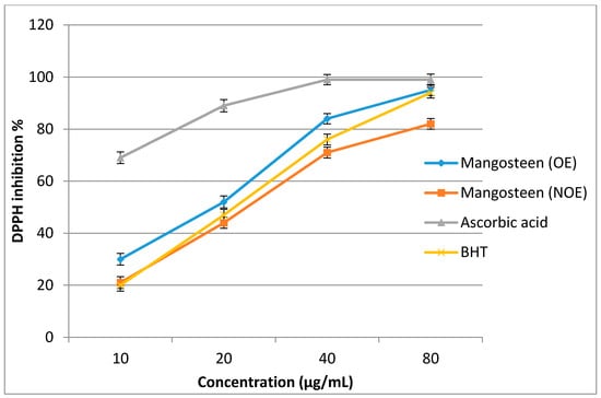 Optimized and non-optimized extracts from the mangosteen pericarp were tested for antioxidant properties using the 2,2-diphenyl-1-picryl-hydrazyl-hydrate (DPPH) assay. The extracts were tested at concentrations ranging from 10 to 80 μg/mL. As shown in Figure 5, the DPPH activity increased significantly with an increase in the concentration of the extracts. The optimized extracts exhibited higher DPPH activity compared to the non-optimized extracts. The optimized extract (OE) presented a lower half maximal inhibitory concentration (IC50 = 20.64 µg/mL) compared to that of the non-optimized extract (NOE; 28.50 µg/mL), which indicates potent antioxidant properties. The result of a recent study showed that the extract of G. mangostana has antioxidant activity with an IC50 value of 30 µg/mL compared to Butylated hydroxyanisole (BHA), (IC50 = 20.0 µg/mL) using the DPPH assay [7]. In another study, α-mangostin isolated from an extract of dried G. mangostana rind showed an antioxidant activity with an IC50 value of 7.4 µg/mL compared to ascorbic acid (IC50 = 4.5 µg/mL) using the DPPH assay [44]. Ascorbic acid as a positive control showed the highest antioxidant activity (IC50 < 10 µg/mL) compared to both the OE and NOE; however, more interestingly, the antioxidant activity of the OE was higher than that of Butylated hydroxytoluene (BHT), (second positive control). In addition, the NOE had less antioxidant activity than that of BHT. As can be seen from Table 5, the OE also exhibited higher ferric reducing antioxidant potential (FRAP) activity (497.42 ± 12.73 μM of Fe (II)/g DM) compared to that of the NOE (344.60 ± 8.61 μM of Fe (II)/g DM). The OE had higher FRAP activity than BHT, but one that was lower than that of ascorbic acid. In general, the antioxidant activity of the mangosteen pericarp extracts improved after the optimization of the extraction process. Due to the higher amount of phytocompounds, the mangosteen extracts possessed superior radical-scavenging activities. The results of several studies indicated that the free-radical-scavenging power of the mangosteen pericarp was significantly correlated with the concentration and type of phytochemicals [6,45,46]. After collecting more data, especially data from the industry, the models should be renewed. Subsequently, the design space should also be recalculated to result in a more reliable and flexible pharmaceutical process.