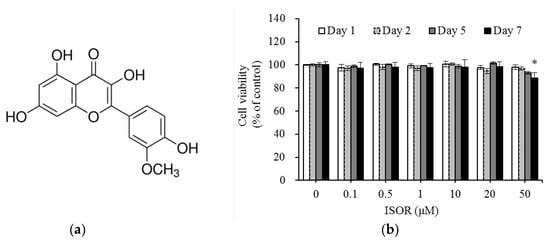 Chemical structures (a) and cell viability (b) of ISOR-treated 3T3-L1 cells. Cells were treated with 0 (control), 0.1, 0.5, 1, 10, 20, or 50 µM ISOR, and incubated for 1, 2, 5, or 7 days. Cell viability was determined using the water-soluble tetrazolium salt (WST)-8 assay. Values are expressed as means ± SE (n = 3) of three independent experiments. ISOR, isorhamnetin. * p < 0.05 vs. control.