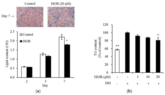 The effects of ISOR on lipid and TG accumulation during adipogenesis were measured, and 3T3-L1 adipocytes were treated with 0 (control) or 20 μM ISOR, for 2, 5, or 7 days (d2 to d9). Intracellular lipid content was measured using Oil Red O-staining. On Day 7 (d9), change of adipocyte differentiation was observed with Oil Red O-staining (Figure 2a). After 7 days of incubation, ISOR inhibited the intracellular lipid content by 19.1%, compared to control cells (Figure 2a). To determine the intracellular TG content, 3T3-L1 adipocytes were treated with 0 (DM-treated control), 1, 10, or 20 μM ISOR for 7 days. The TG content significantly decreased by 19.3% in the presence of 20 μM ISOR, compared to the DM-treated control (Figure 2b).