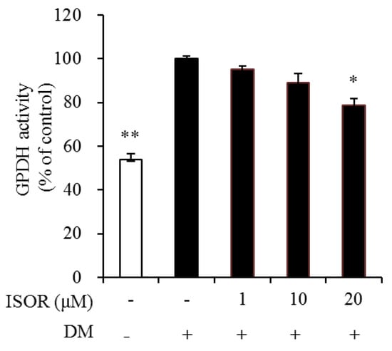 To elucidate the mechanism by which ISOR inhibits lipid and TG accumulation, GPDH activity was measured in ISOR-treated 3T3-L1 adipocytes. Cells were incubated with 0 (DM-treated control), 1, 10, and 20 μM ISOR, and incubated for 7 days. GPDH activity was significantly decreased by 21.5% in the presence of 20 μM ISOR, compared to the DM-treated control (Figure 3)