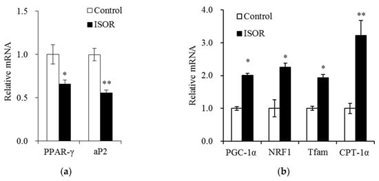 We evaluated whether ISOR attenuates the expression of genes involved in adipogenesis and mitochondrial function in 3T3-L1 adipocytes. Cells were treated with 0 (control) or 20 µM ISOR, and incubated for 7 days. In ISOR-treated cells, mRNA levels of PPAR-γ, and adipocyte protein 2 (aP2) were significantly lower (34% and 44%, respectively), than those of controls (Figure 4a). Conversely, mRNA levels of PGC-1α, NRF1, and Tfam, which regulate mitochondrial biosynthesis, were significantly higher (2.0-, 2.3-, or 1.9-fold, respectively), in ISOR-treated cells than in controls (Figure 4b). The mRNA level of CPT-1α, which regulates fatty acid oxidation, was also significantly higher by 3.2-fold in ISOR-treated cells, than in control (Figure 4b).