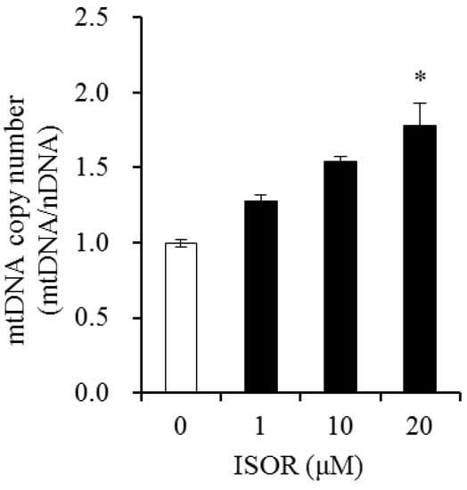 The effect of ISOR on mtDNA copy number, was determined by the ratio of mtDNA to nuclear DNA (nDNA) in 3T3-L1 adipocytes. Cells were incubated with 0 (control), 1, 10, and 20 μM ISOR, and incubated for 7 days. In the presence of 20 μM ISOR, the mtDNA/nDNA ratio significantly increased 1.78-fold, compared to the control (Figure 5).