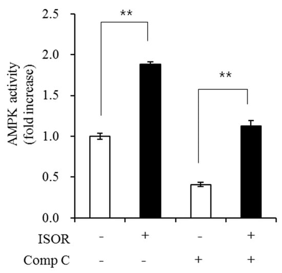 To evaluate whether ISOR affected the activity of AMPK, which modulates lipid metabolism and mitochondrial biogenesis in 3T3-L1 adipocytes, cells were treated with 0 (control) or 20 μM ISOR for 7 days and incubated with 1 μM of compound C (Comp C) as an AMPK inhibitor for 16 h. AMPK activity in the presence of 20 μM ISOR. without or with Comp C was significantly higher (at 1.9-, or 2.7-fold, respectively), than those of the controls (Figure 6).