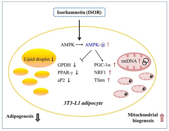 Isorhamnetin (ISOR), 3-O-methylquercetin, is a naturally occurring flavonoid in many plants. It is a metabolite derived from quercetin and is known to exert beneficial effects on the prevention of obesity. However, the molecular mechanism of action involved in ISOR-mediated mitochondrial biogenesis, and AMP-activated protein kinase (AMPK) activation in 3T3-L1 cells remains unclear. The aim of this study was to determine whether ISOR affected mitochondrial biogenesis and AMPK activation, during 3T3-L1 adipocyte differentiation. Intracellular lipid and triglyceride accumulation, and glycerol-3-phosphate dehydrogenase (GPDH) activity decreased in ISOR-treated cells. The mRNA levels of adipogenic genes, such as the proliferator-activated receptor-γ (PPAR-γ), and adipocyte protein 2 (aP2), were inhibited by ISOR. In contrast, mRNA levels of mitochondrial genes, such as peroxisome proliferator-activated reporter gamma coactivator-1α (PGC-1α), nuclear respiratory factor (NRF)-1, transcription factor A (Tfam), and carnitine palmitoyl transferase-1α (CPT-1α), were all stimulated by ISOR treatment. Mitochondria DNA (mtDNA) copy number and AMPK activity were also stimulated by ISOR. The results suggested that the mitochondrial biogenic effect of ISOR in adipocytes might have been associated with stimulation of mitochondrial gene expression, mtDNA replication, and AMPK activation.