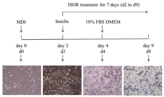 The culture of 3T3-L1 cells was performed as described previously [37]. Mouse 3T3-L1 preadipocytes were maintained in DMEM containing 10% (v/v) BCS, 100 units/mL penicillin, 100 μg/mL streptomycin, and 2 mM glutamine under conditions of 37 °C and 5% CO2. For the induction of adipocyte differentiation, the preadipocytes were cultured to confluence (day 0, d0) and were exposed to a differentiation medium containing 0.5 mM isobutylmethylxanthine, 1 μM dexamethasone, and 5 μg/mL insulin (MDI) for 2 days (d2) in DMEM containing 10% FBS. The cells were cultured with 5 μg/mL insulin for 2 days (d4), and then subsequently cultured in DMEM containing 10% FBS for 5 days (d9) (Figure 8). Isorhamnetin (ISOR) was treated with the medium for 7 days (from d2 to d9). Cells incubated without treatment served as a control. All assays were carried out in triplicate.