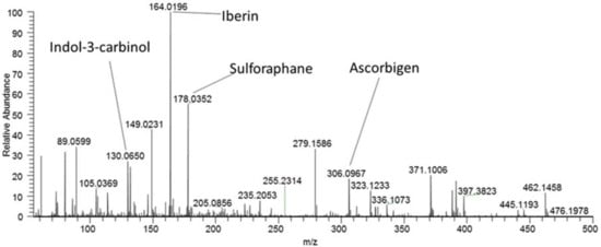 DART-Orbitrap-MS spectrum of an ethylacetate extract of Albatros cv. (integrated production) measured in the positive ionization mode. The identified GSL degradation products are described in Table 5.
