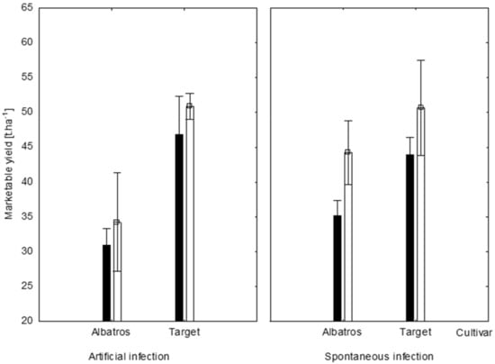 Effects of production system and fungal infection on the crop yield of Albatros and Target cultivars. Integrated system (unshaded columns), ecological system (shaded columns).