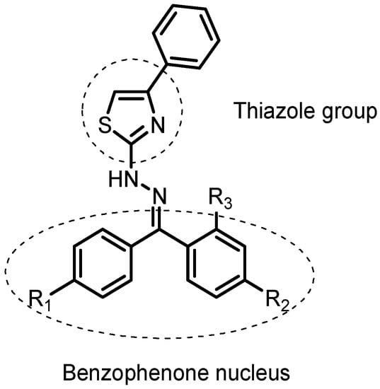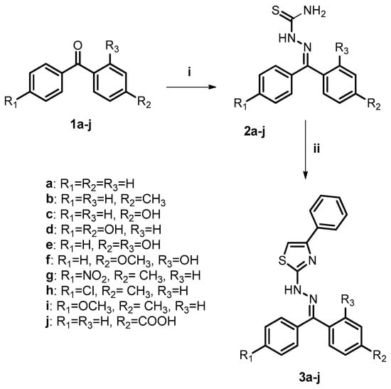 General synthesis of benzophenone thiazole derivatives. Reagents and conditions: (i) thiosemicarbazide (TSC), TsOH, MeOH, 70 °C, 10 h; (ii) 2-bromoacetophenone, i-PrOH, r.t., 4 h.