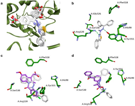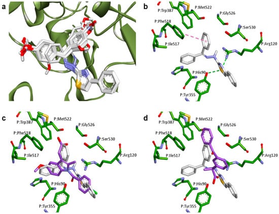 Docking results of planned compounds into COX-2 active site (PDB ID: 3NT1). (a) Conformation of planned compounds found in their most stable complex with COX-1; (b) Interaction of 3a (white carbons, yellow sulfurs, blue nitrogens and red oxygens) and COX-2 active site (green carbons). Hydrogen bonds (dotted green line) are indicated; (c) Conformation comparisons between 3a (white carbons) and indomethacin (purple carbons) interacting with COX-2 (green carbons); (d) Conformation comparisons between 3a (white carbons) and ketoprofen (purple carbons) interacting with COX-2 (green carbons).