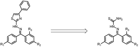 The planned thiazole derivatives are obtained from the respective thiosemicarbazones precursor, as shown in the retrosynthetic analysis in Figure 4. The presence of thiosemicarbazone moiety has already been associated with the anti-inflammatory activity of several compounds [26,27] suggesting that these starting materials could also present an anti-inflammatory potential. Thus, we decided to include these molecules in the docking analysis. The predicted binding energies for the best score complexes between thiosemicarbazones and COX isoenzymes are shown in Table 2.