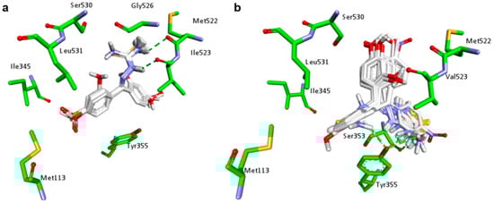 Docking studies indicated that the thiosemicarbazone moiety appears to be important in the interaction between series 2 compounds and COX-1, mediating two hydrogen bonds with MET522 and ILE523 residues in the enzyme active site, as shown in Figure 5a. The predicted binding modes of 2a–2j into the COX-2 active site also suggest the importance of the thiosemicarbazone moiety in the interaction, while only one hydrogen bond is observed, which involves the terminal NH2 of thiosemicarbazones and SER353 or TYR355 residue (Figure 5b).