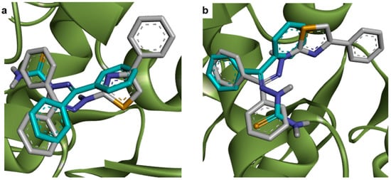 Comparative analysis of predicted poses of thiosemicarbazones and thiazoles into COX isoenzymes active sites (green ribbon). (a) Comparison between of 2a (cyan carbons, yellow sulfurs, blue nitrogens and red oxygens) and 3a (white carbons) poses into COX-1 (PDB ID: 2OYU) active site; (b) Comparison between of 2a (cyan carbons) and 3a (white carbons) poses into COX-2 active site (PDB ID: 3NT1).