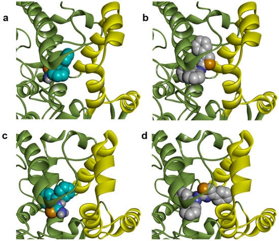 Conformations of 2a (cyan carbons, yellow sulfur, blue nitrogen) and 3a (white carbons) into COX isoenzymes active sites, highlighting their position relative to the catalytic (green ribbon) and the membrane binding domain (yellow ribbon). (a) Pose of 2a into COX-1 (PDB ID: 2OYU) active site; (b) Pose of 3a into COX-1 (PDB ID: 2OYU) active site; (c) Pose of 2a into COX-2 (PDB ID: 3NT1) active site; (d) Pose of 3a into COX-2 (PDB ID: 3NT1) active site.