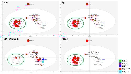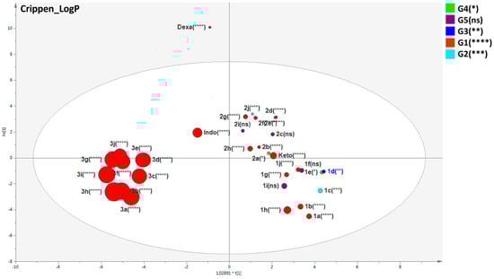 Scatter plot of the supervised O2PLS-DA model using twenty-eight selected descriptors (calculated on PaDEL v.2.2.1 software) explaining the molecular features correlated to the benzophenone derivatives. The size of each variable was defined in the graph properties as being directly correlated to the CrippenLogP to evaluate the values of this feature among all substances. The compounds used as standards in the anti-inflammatory assay (dexamethasone, indomethacin, and ketoprofen) were also evaluated in this model. The asterisks denote the levels of significance in comparison with vehicle (n = 8). G1 (**** p ≤ 0.0001); G2 (*** p ≤ 0.001); G3 (** p ≤ 0.01); G4 (* p ≤ 0.05), ns = not significant.