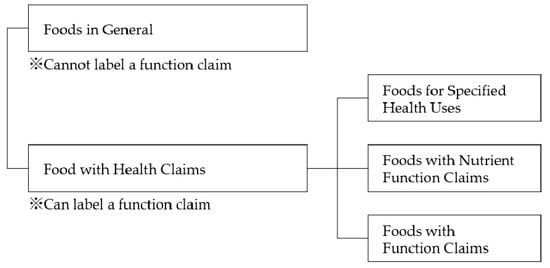 In Japan, the legal definition of “food” has been divided into “Foods in General” and “Foods with Health Claims”. A product classified as a “Foods in General” cannot be labeled with any health benefits. A product accepted under the category of “Foods with Health Claims” can be labeled with specified health claims or nutrient function claims. The advertisement of foods classed as “Foods in General” is strictly controlled. The classification “Foods in General” is the base level and cannot be described further. The next category, “Foods with Health Claims”, was divided, until recently, into “Foods for Specified Health Uses” and “Foods with Nutrient Function Claims”. In order to make more products that were clearly labeled with functional claims based on scientific evidence available to the general public, and to enable consumers to make more informed choices, an additional category “Foods with Function Claims” was introduced in April 2015, as shown in Figure 1 [,].