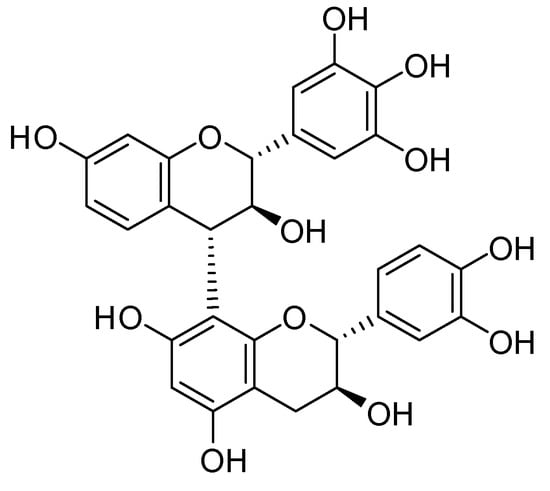 Robinetinidol-(4α,8)-catechin, shown in Figure 2, was reported as being a constituent of A. mearnsii and, to date, has not been isolated from other plants [,,,,]. Therefore, whether A. mearnsii extract is included in any preparation may be determined by establishing if robinetinidol-(4α,8)-catechin is present. The qualitative analysis for proanthocyanidins was performed by HPLC, as shown in Figure 3. The detailed method of qualitative analysis is described below.