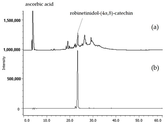 HPLC profiles of (a) ACAPOLIA PLUS (1 tablet/10 mL) and (b) robinetinidol-(4α,8)-catechin. Detection wavelength: 230 nm; injected volume: 10 μL for each sample.