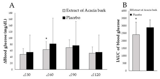 The scientific evidence for the proposed functional claims must be explained by one of the following methods. The first is a clinical trial with a finished product, and the second is a systematic literature review on a finished product or functional substance. In this case, a clinical trial with the finished product, ACAPOLIA PLUS, was conducted and reported by Takeda et al. [] in 2016. Subjects in this study were as follows; (1) non‒diabetic men and women aged between 40 and 60 years of age; and (2) possessed a fasting plasma glucose (FPG) level of between 110‒125 mg/dL or an impaired glucose tolerance (120 min glucose level in a 75 g oral glucose tolerance test (OGTT), between 140‒199 mg/dL). A total of 13 subjects were finally selected for this study. The changes in the blood glucose levels were monitored over a period of 120 min after taking ACAPOLIA PLUS or a placebo before consuming 200 g of cooked rice. The results showed that the amount of change in the plasma glucose concentration in the initial 60 min after rice consumption in the Acacia group (the group given ACAPOLIA PLUS) was statistically lower than the group that was given a placebo, see Figure 4A. The blood glucose incremental postprandial areas under the curve (IAUC), shown in Figure 4B, in the initial 60 min after the consumption of rice were also significantly lower in the Acacia group. This study was conducted with relatively few participants and therefore should be repeated with larger numbers of participants. However, from the limited study, it was concluded that the ACAPOLIA PLUS containing proanthocyanidins derived from A. mearnsii bark did reduce the absorption of carbohydrates and limited the rise of blood glucose in humans.