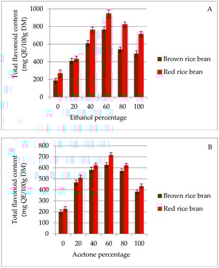 In the current study, two solvents, namely acetone and ethanol, with different polarities were used to extract flavonoids from two pigmented (red and brown) rice brans. A significant difference between acetone and ethanol was observed for the extraction of total flavonoids from rice bran (Figure 1). In red and brown rice bran, the highest total flavonoid content (TFC) values (946.4 and 765.8 mg quercetin equivalents (QE)/100 g dry matter (DM), respectively) were observed in 60% (v/v) ethanolic solution (Figure 1A). This result may be due to the similar polarities of this solution and the flavonoids present in the bran. In contrast, it can be observed from Figure 1B that TFC extraction in acetone was not significantly different for red and brown rice bran at concentrations of 0–40% (v/v). This behavior may result from the lower polarity of the acetone medium [27], which inhibits the extraction of higher polarity substances from the rice bran and, hence, the TFC value plateaus. The lowest TFC value from both rice brans was observed for 100% water. Moreover, extraction with pure water as a solvent resulted in high impurities, which led to a decrease in flavonoid quantity [28]. The results of this study show that for extraction of flavonoids from red and brown rice bran, ethanol and acetone are more efficient than pure water. Therefore, an extraction solvent of 40–80% (v/v) ethanol or acetone was chosen in subsequent experiments.