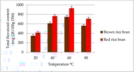 The influence of temperature on the extraction yield of total flavonoids in ethanolic (50% v/v) extracts is given in Figure 2. The maximum TFC was obtained at 60 °C for both rice brans. In contrast, the minimum TFC value was observed at 20 °C for both red (412.8 mg QE/100 g DM) and brown rice bran (346.7 mg QE/100 g DM) extracts. An increased temperature during extraction softens plant tissues, thereby weakening phenol–protein and phenol–polysaccharide interactions. Such weakened interactions may enhance the diffusion of secondary metabolites, such as flavonoids, into the extraction media. Moreover, compositional differences between the secondary metabolites in red and brown rice bran could account for the variation with extraction temperature. Oxidation and decomposition of secondary metabolites at higher temperatures results in a reduction of flavonoid compounds in extracts [29,30]. Therefore, an extraction temperature range of 40–80 °C was selected for subsequent experiments.