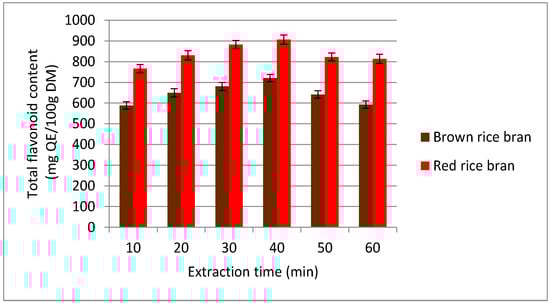 To economize the secondary metabolite extraction process, reducing/minimizing the extraction time is essential. In the current study, an extraction time range of 10–60 min was tested for recovery of flavonoids (Figure 3). On increasing the extraction time from 10 to 40 min, the TFC value increased significantly. Further increasing the extraction time to 60 min resulted in a decrease of the TFC value. From these results, it was determined that flavonoid extraction from red and brown rice bran is complete within approximately 40 min. The reduction of the secondary metabolite content in the extract at higher temperatures was explained by Fick’s second law [31], which states that the concentrations of compounds in the extract reach a final equilibrium after a certain time and after this time, no further recovery can be achieved [32]. Furthermore, the decrease in the TFC at longer extraction times might be due to changes in the molecular structure or oxidation of flavonoids [33]. Hence, for further experiments, an extraction time of 30–50 min was selected.