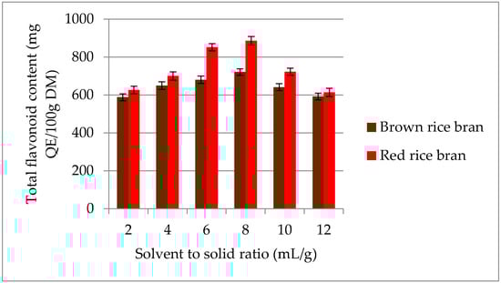 The highest TFC was recorded at an S/S ratio of 8 mL/g for both red (886.4 mg QE/100 g DM) and brown rice bran (720.8 mg QE/100 g DM) (Figure 4). On increasing the S/S ratio from 8 to 12 mL/g, the TFC decreased significantly. The initial increase in the TFC with increasing S/S ratio is correlated with mass-transfer principles. Diffusion of secondary metabolites into the solvent (mass transfer) during the extraction process depends on the concentration gradient between the solid and liquid [34]. However, above a certain S/S ratio, a decrease in the extraction yield was observed. It is possible that larger amounts of liquid do not change the driving force further because the mass-transfer process is highly restricted to the solid interior, thus decreasing total flavonoid recovery [35]. Therefore, in the current study, an S/S ratio of 6–10 mL/g was selected for further experiments.