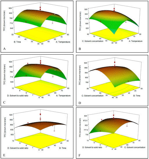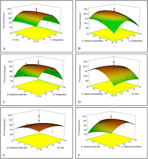 (A–F) Response surface plots for the effects of temperature, time, solvent percentage, and S/S ratio on total flavonoids content (TFC) of red rice bran.