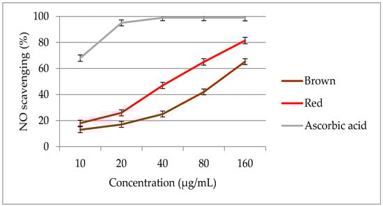The optimized extracts from red and brown rice bran were examined for NO scavenging activity at various concentrations (Figure 7). The extracts were tested in the concentration range of 10–160 μg/mL. The NO activities of the pigmented rice brans ranged from 13.0 to 81.2%, with significant differences (p < 0.05) among the pigmented rice genotypes. A significant increase (p < 0.05) in NO activity was observed on increasing the rice bran concentration from 10 to 160 μg/mL. The extract of brown rice bran demonstrated a weaker NO scavenging activity than the extract of red rice bran.