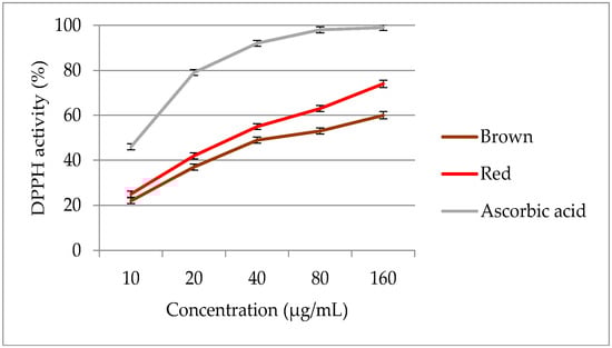 On increasing the extract concentration from 10 to 160 µg/mL, the DPPH radical scavenging power increased significantly (Figure 8). The DPPH activity of red and brown rice bran ranged from 12.4 to 74.9%, and significant (p < 0.05) differences in DPPH activity were observed between the two pigmented rice varieties. In terms of DPPH activity, the extract of red rice bran exhibited the higher activity than the extracts of brown rice bran. Both pigmented rice brans exhibited lower DPPH activities than ascorbic acid (EC50 = 11.74 μg/mL). Red rice bran had a lower EC50 value (33.6 μg/mL) than brown rice bran (48.7 μg/mL), indicating the potent antioxidant properties of red rice bran. In the extract of red rice bran, a high DPPH activity with a low EC50 value could be related to a greater concentration of flavonoids in this genotype. Thus, red rice bran extracts may provide superior radical scavenging activities owing to a higher amount of phytocompounds. The results of several studies have indicated that the free radical scavenging power of pigmented rice brans show significant correlation with the content and type of phytochemicals [51,52,53]. After collecting more data, especially data from industry, the models should be reevaluated. Subsequently, the design space should also be recalculated to realize a more reliable and flexible pharmaceutical process.