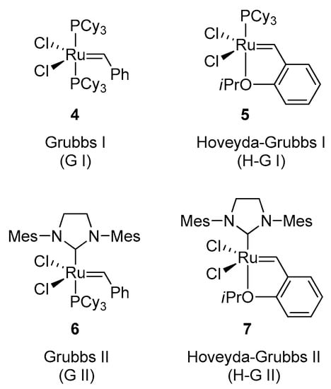 - Vougioukalakis, G.C.; Grubbs, R.H. Ruthenium-based heterocyclic carbene-coordinated olefin metathesis catalysts. Chem. Rev. 2010, 110, 1746–1787. [Google Scholar] [CrossRef] [PubMed]