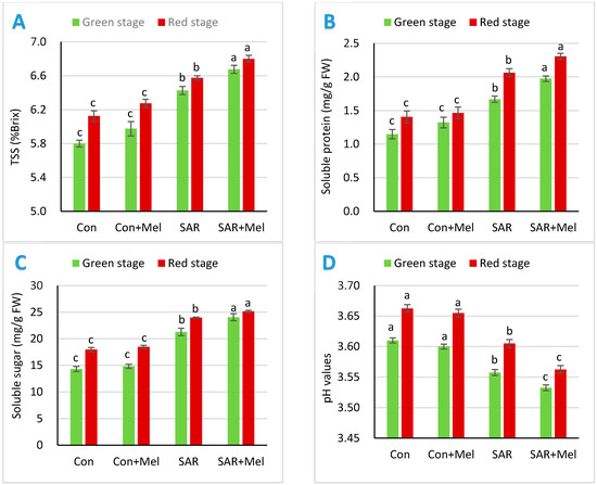 To observe the impact of exogenous melatonin treatment under SAR condition on tomato fruit qualities, we estimated the total soluble solid, soluble sugar, soluble protein, pH values in tomato fruits. The amount of TSS, soluble sugar, soluble protein content in fruits determines the sensory characteristics mainly taste and sweetness. The pH value considered to be the consistent parameter of fruit quality and the critical standards in processing industry as they influenced in the shelf life of fruits. As shown in Figure 1, the values of TSS, soluble sugar, soluble protein were increased significantly by 10.86%, 48.74%, 45.22%, respectively in SAR-stressed plants at mature green stage where as these values were increased by 7.34%, 35.59%, 46.1%, respectively in red stage of tomato fruits compared with those in control plants. However, pH values of tomatoes were decreased significantly by 1.39% and 1.37% at mature green stages and red stage, respectively compared with fruits of control plants (Figure 1). The several previous studies observed that abiotic stress boosted the sensory attributes by increasing the TSS, soluble sugar, soluble protein content and decreasing the pH values in tomato fruits [10,22]. Also, supplementation of exogenous melatonin to SAR-stressed plants resulted obvious increased the fruit quality attributes compared to SAR-stressed plants. The TSS, soluble sugar and soluble protein contents in mature green fruits of SAR-stressed plants treated with melatonin increased by 3.89%, 13.12% and 17.96%, respectively, and in red fruits of these values were increased by 3.34%, 4.88% and 12.14%, respectively compared with fruits of SAR-stressed plants (Figure 1). However, the pH values were further decreased significantly in fruits of SAR and melatonin both treated plants compared with the plant exposed to SAR (Figure 1). Whereas, the melatonin supplementation in control plants showed insignificant differences on these fruits quality attributes compared with fruits of control plants (Figure 1). Previous studies reported that melatonin improved fruits quality during fruit development and ripening stages by reduction of cell wall degradation and intercellular adhesion [31]. The findings of our study showed that melatonin improves the fruit quality attributes under SAR stress condition.