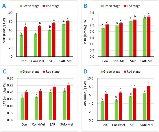 To identify the SAR-induced changes in the enzymatic antioxidative system of tomato fruits and the role of exogenous melatonin in these respects, we evaluated SOD, POD, CAT and APx activities at mature green and red stage of tomato fruits. The current experiment presented that the activities of SOD, POD, CAT, and APx in fruits of tomato plant at mature green and red stage both were significantly increased by SAR condition compared with fruits of control plants (Figure 2). SAR stressed may cause the impairment of tomato fruits which can be lessened by enhancing the activities of antioxidants compounds to reduced oxidative damage. The results of our study showed that like other parts of plants, tomato fruits also increased the accumulation of reactive oxygen species scavenging enzymatic antioxidant compounds to overcome oxidative damage occurred by SAR stressed compared with control condition (Figure 2). The findings of our study agreed with previous study that antioxidant enzymes in fruits of tomato might have a great role to improve protection mechanism by reducing oxidative and membrane damage under different environmental stress condition [23,24]. Interestingly, melatonin supplementation in SAR-stressed plants caused increased evidently the accumulation of SOD, POD, CAT and APx contents in fruits compared with those in fruits of plants exposed to SAR (Figure 2). Meanwhile, our results indicated that melatonin treatment in SAR-stressed plants served as an indicator to enhance defense system by more rising the accumulation of the ROS-scavenging antioxidant enzymes in tomatoes compared with fruits of SAR alone treated plants. These consequences supported with our previous and other researcher’s studies that melatonin may have an important role to protect the plants by reducing oxidative damage against different abiotic stress conditions [26,29].